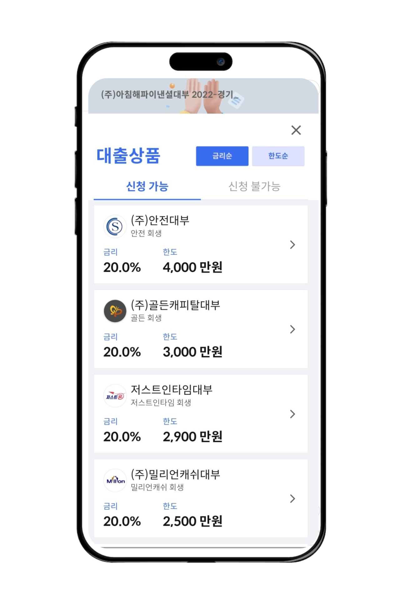 대출금리 연 20%이내 (연체금리는 약정금리 +3% 이내, 최대 연20% 이내)l연체금 보유, 신용점수 등 낮음등의 사유로 대출이 제한될 수 있습니다.